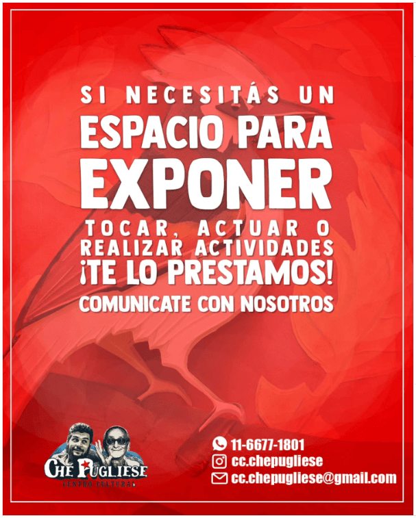 Desde 2019, el Centro Cultural Che Pugliese se consolida como un espacio autogestivo en el barrio de Villa Mitre, ubicado en Av. Boyacá 1508. Nacido del impulso colectivo de artistas, trabajadores y militantes de la cultura, su tarea principal es reconstruir el tejido social y comunitario a través de propuestas culturales, educativas y solidarias.